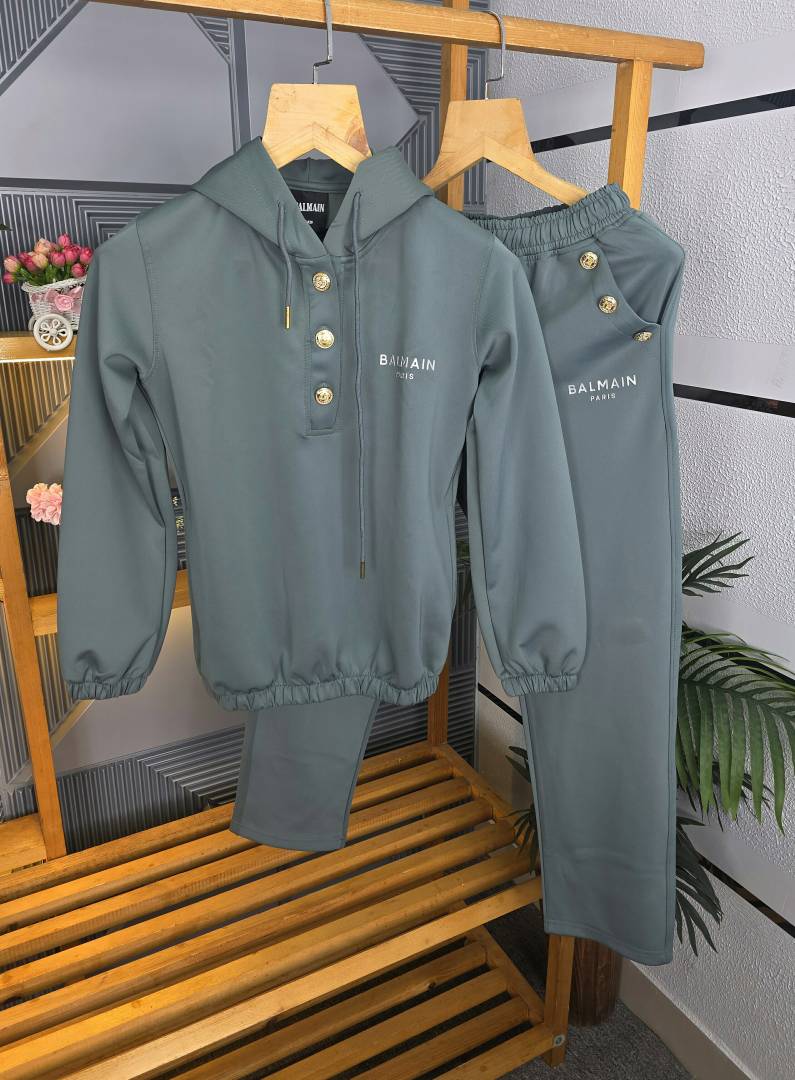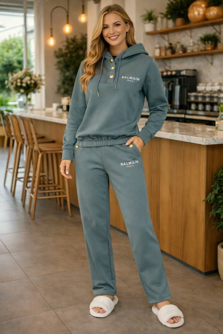 The set features a relaxed-fit jacket style top with a modern silhouette and matching straight-leg pants