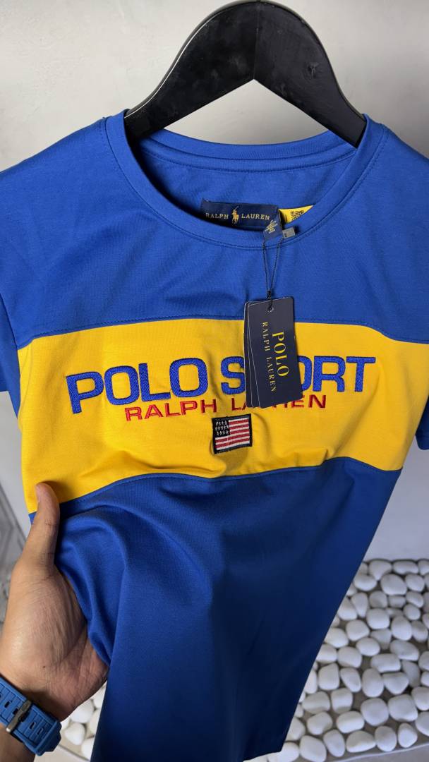 Inspired by vintage athletic heritage, this Polo Sport tee features a bold blue and yellow colorblock design with embroidered Polo Sport branding and signature flag detailing. Made from breathable premium cotton-blend fabric, it offers all-day comfort with sporty appeal. A must-have for those who love retro luxury sportswear vibes.